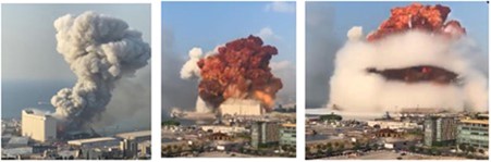 Blast explosion at time 5:55 pm (initial explosion) and at 6:08 pm (orange and mushroom cloud) at the port of Beirut (Source online).